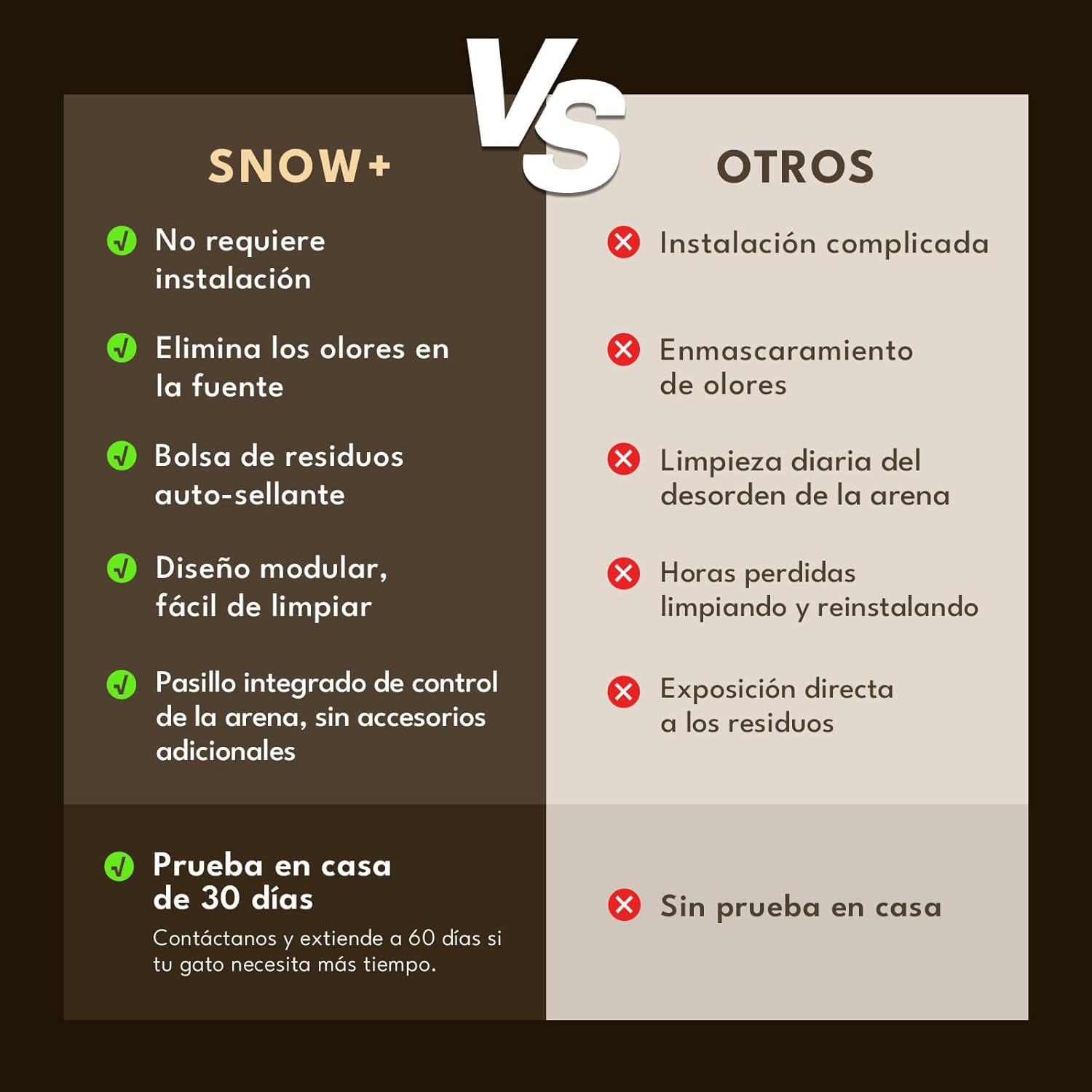 Comparado con otros areneros automáticos, el PetSnowy Snow+ se destaca por su capacidad y su sistema de desodorización avanzada. Mientras que otros modelos pueden carecer de una app de control, el Snow+ permite monitorear el uso en tiempo real, lo que lo convierte en una opción preferente para hogares con más de un gato.