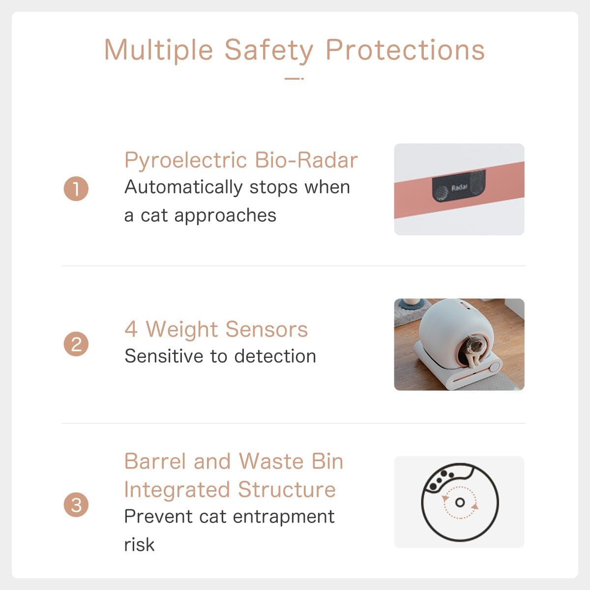 - Protección de seguridad: Equipado con sensores que evitan que el mecanismo funcione cuando hay un gato cerca, lo que minimiza el riesgo de accidentes.