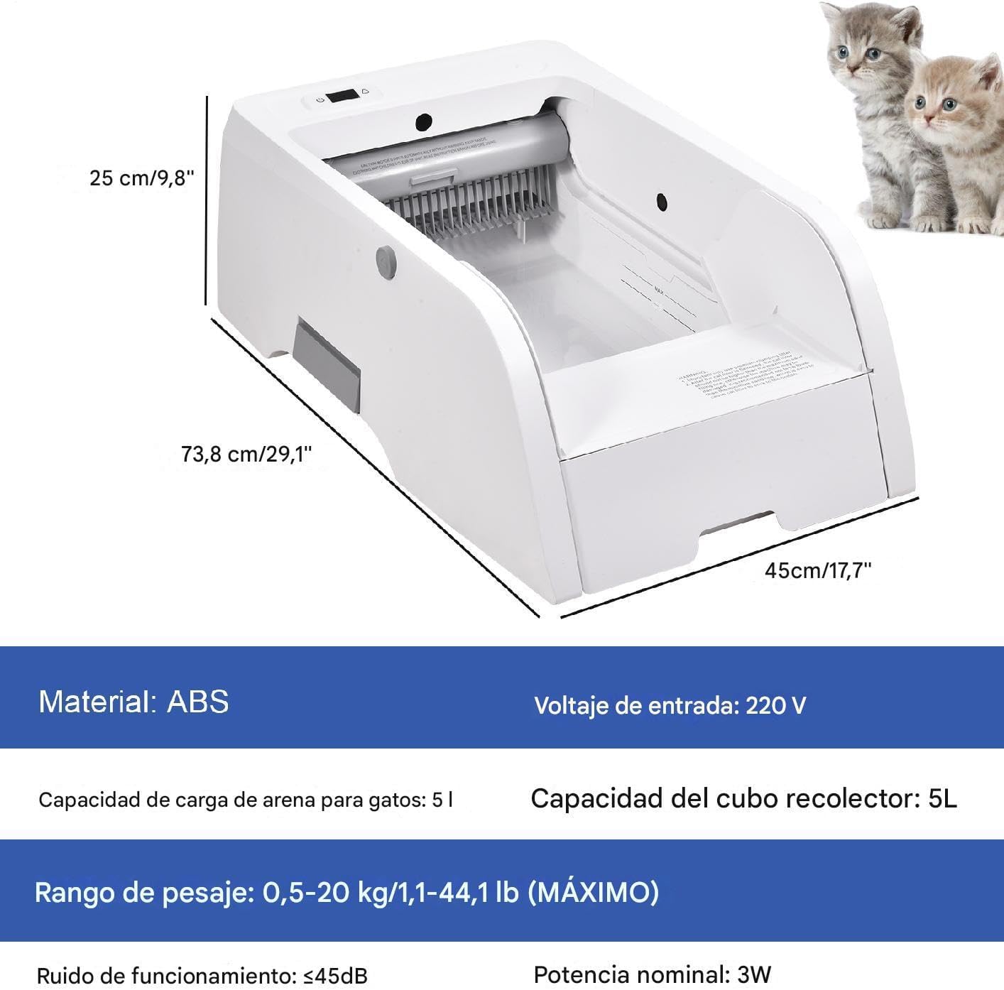 3. ¿Cuáles son las especificaciones técnicas de Self-Cleaning Cat Litter Box Open 5 Litre Large Capacity Excellent Odor Control for Homes with One or More Cats 74 x 25 x 45 cm?