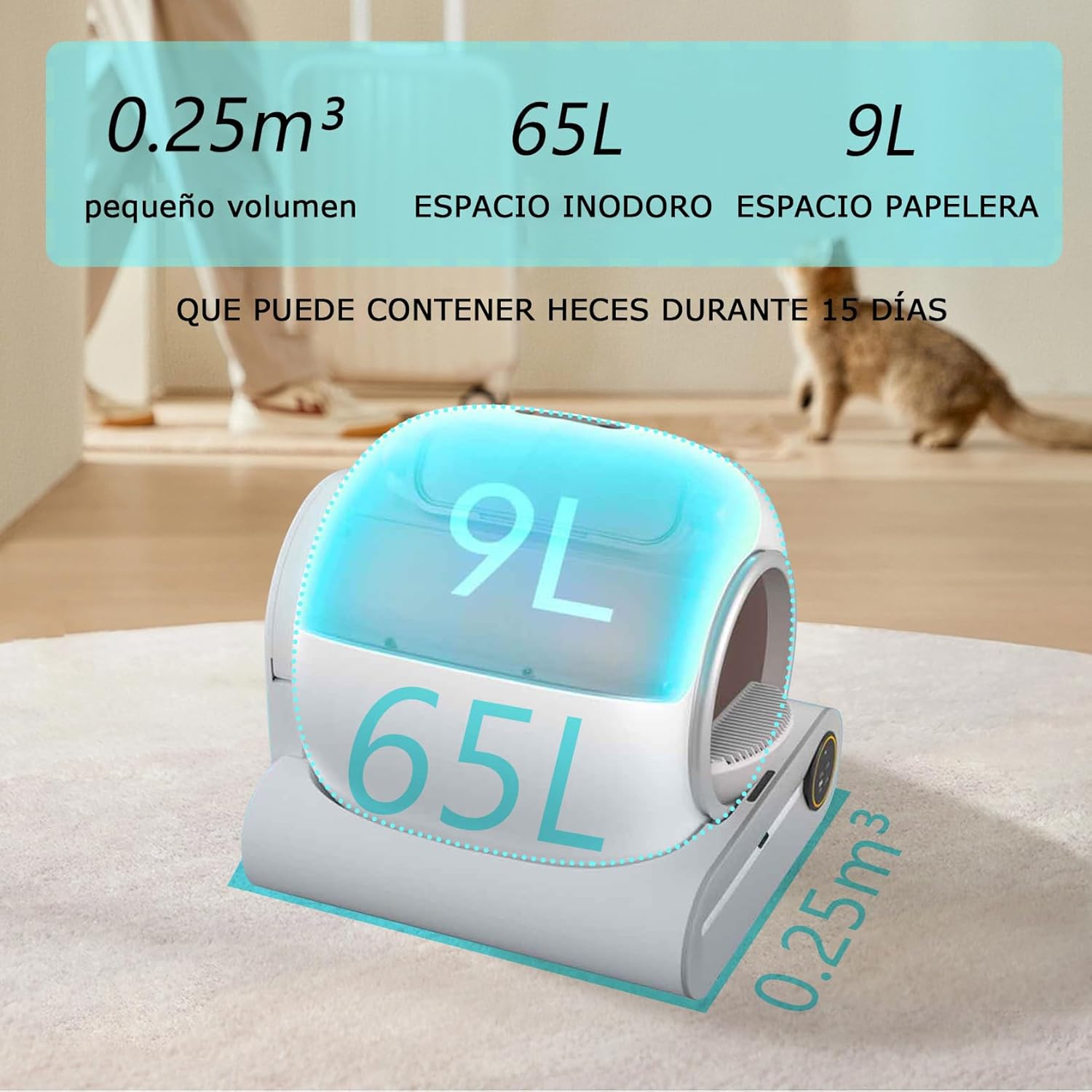 - Capacidad de 65L: Permite mantener la arena limpia y evita la necesidad de cambiarla constantemente.