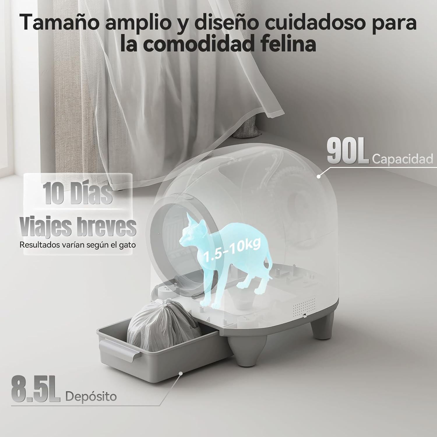 - Capacidad Grande: Ideal para hogares con varios gatos, su amplia capacidad permite un uso prolongado antes de que sea necesario vaciar el depósito.