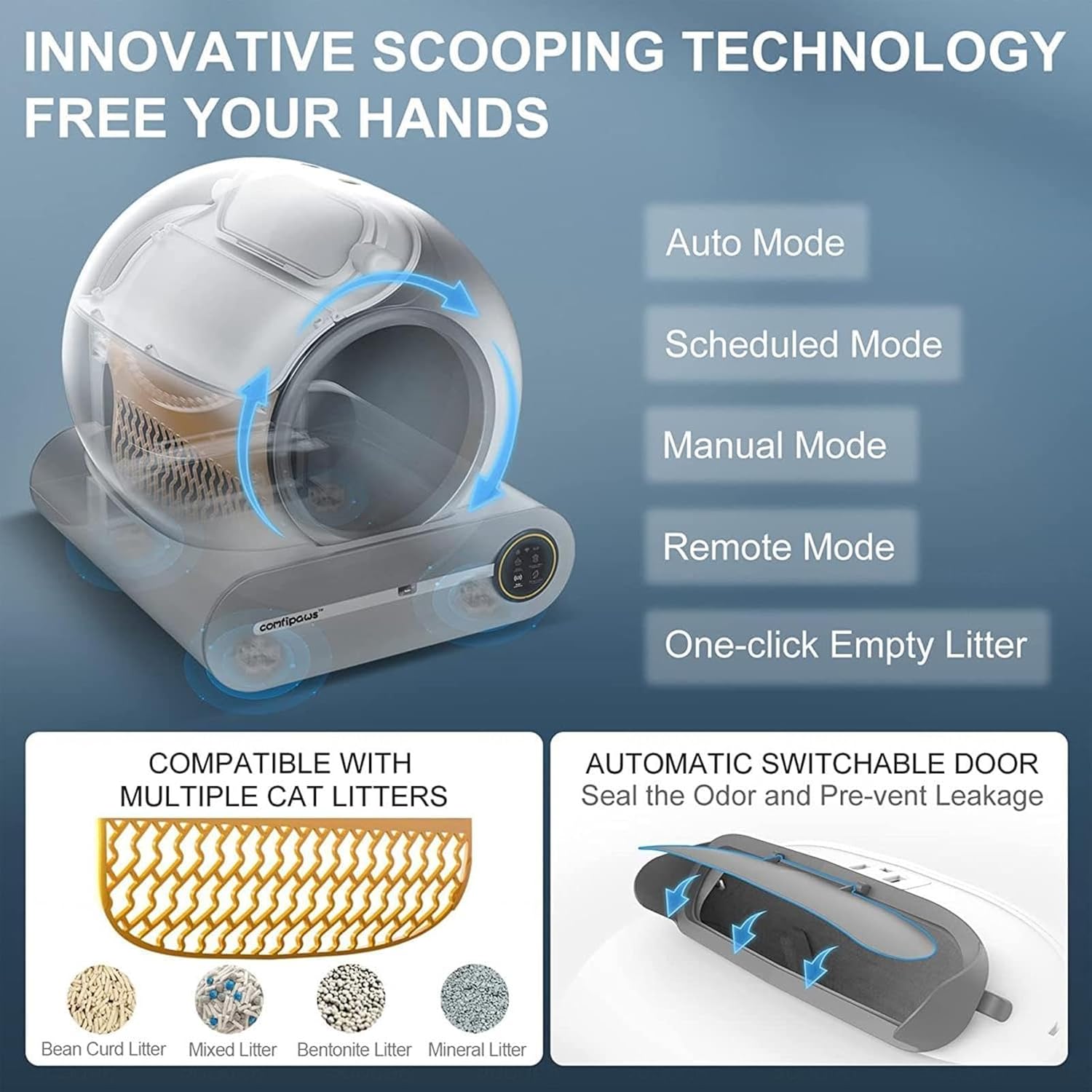 El Inodoro para Gatos Autolimpieza 65 L + 9 L es la solución ideal para quienes buscan comodidad y eficacia en el cuidado de sus felinos. Este arenero innovador no solo ofrece una gran capacidad, sino que también está diseñado con tecnología de limpieza automática y control mediante app. Los propietarios de varios gatos encontrarán en este producto la manera perfecta de mantener un ambiente higiénico y libre de olores, lo que lo convierte en una excelente inversión para el bienestar de sus mascotas.