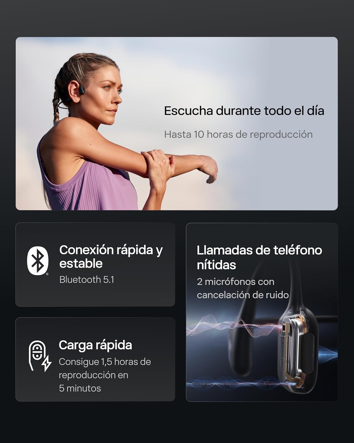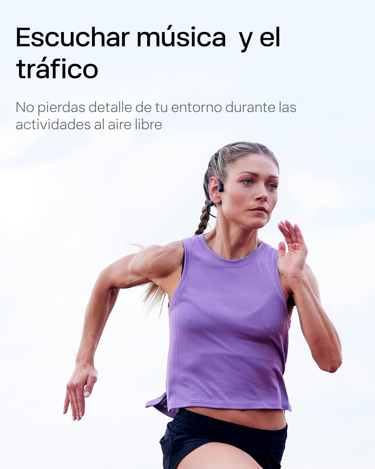 • Tecnología de conducción ósea: Transmiten sonido a través de los huesos del cráneo, permitiendo escuchar música y sonidos ambientales al mismo tiempo.