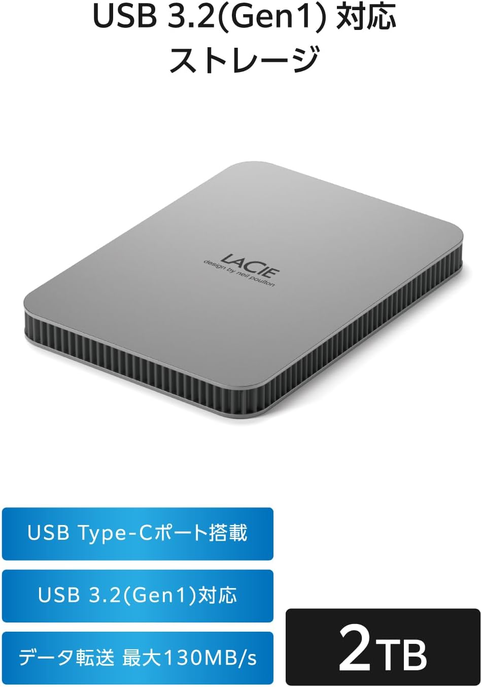 El LaCie Mobile Drive resalta por su diseño moderno y resistente, hecho de materiales sostenibles. Perfecto para quienes trabajan en el ámbito creativo gracias a su compatibilidad con diferentes dispositivos y su conexión USB-C.