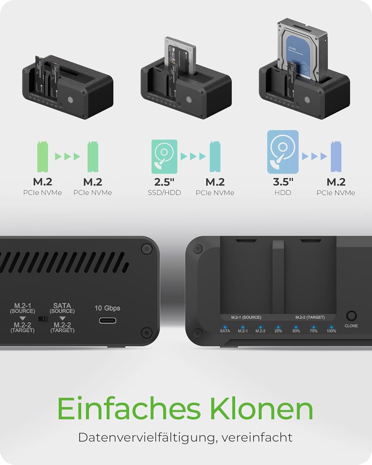 Reseña: El producto es interesante, ya que permite clonar SSDs y leer HDDs, pero no funcionó con mi disco duro de 16 TB, por lo que tuve que devolverlo. -