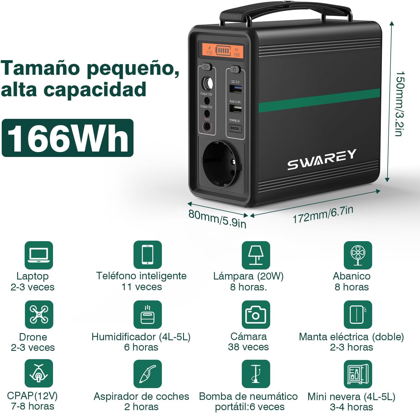La Estación de Energía Portátil con batería de LiFePO4 de 166Wh es la solución ideal para aquellos que buscan una fuente de energía confiable y móvil para camping, viajes o situaciones de emergencia en el hogar. Con su salida de CA de 150W, capaz de alcanzar un pico de 300W, y un puerto USB-C de 30W, este generador solar portátil ofrece suficiente energía para cargar dispositivos y pequeños electrodomésticos. Ya sea para iluminar su carpa, cargar teléfonos o mantener su nevera portátil funcionando, esta estación de energía se presenta como una opción versátil y eficiente en su categoría.