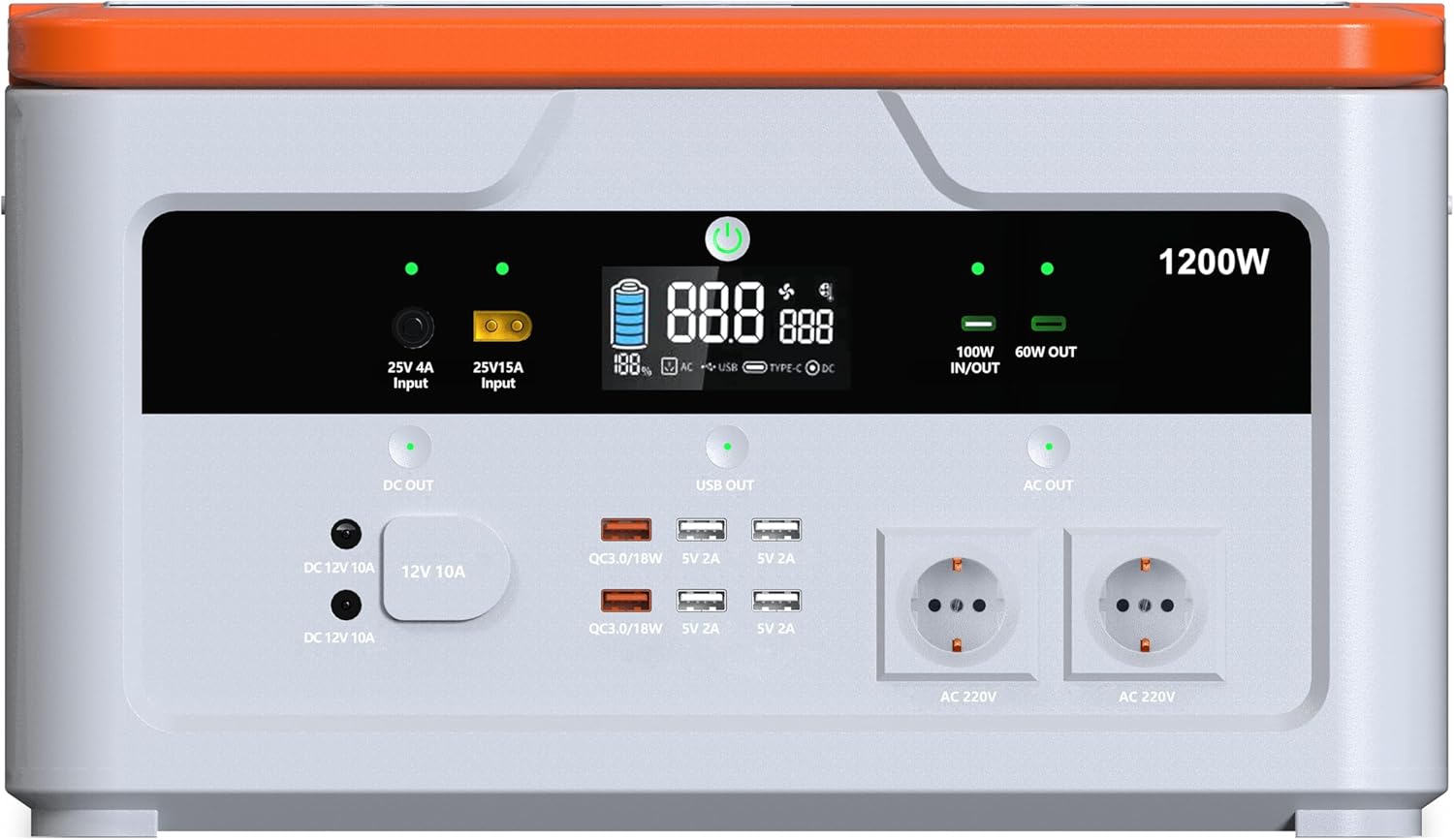 Jandei – Estación de energía portátil 1200W 13 Salidas. USB, DC5.5, 12VDC 220VACx USB, 2xType-C, 3 Carga inalámbrica Onda Pura MPPT
