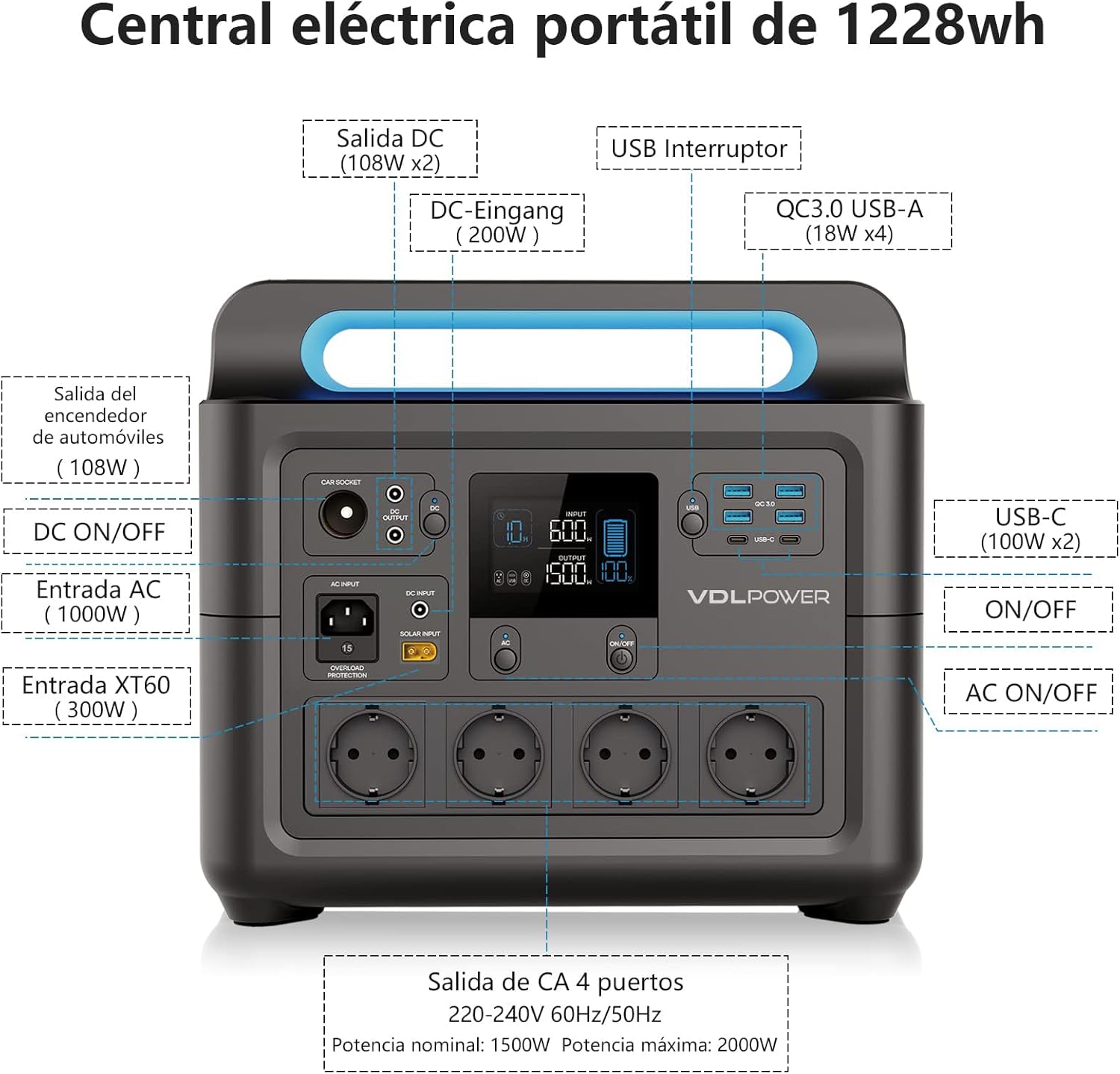 - Rendimiento Alto: Capacidad de 1228Wh, ideal para un uso prolongado.