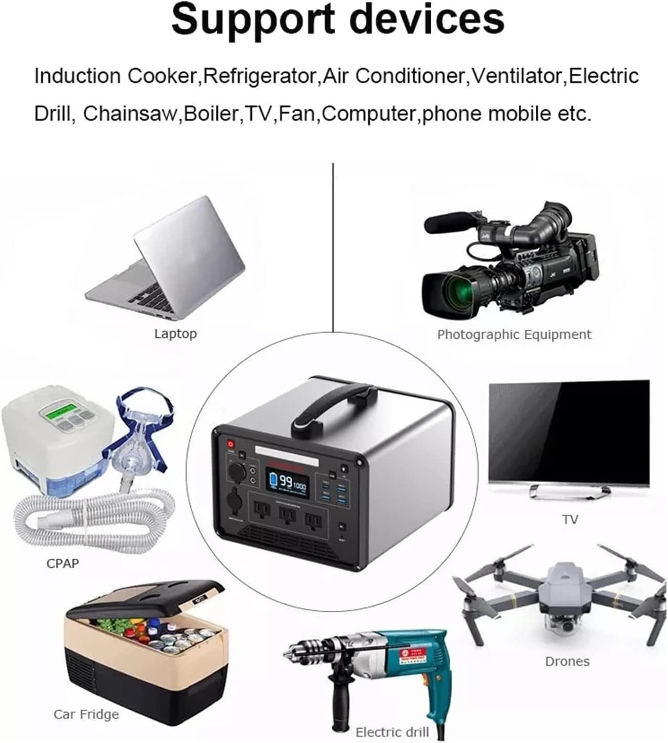 Capacidad Robustecida: Con una potencia de salida de 1000 W, es capaz de alimentar una variedad de dispositivos electrónicos, desde móviles hasta electrodomésticos pequeños.