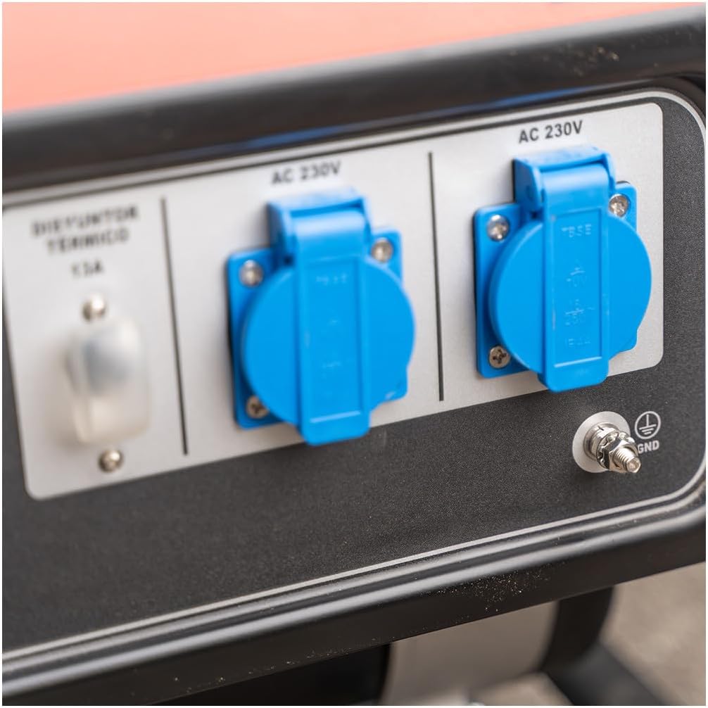 Con dos tomas de 230V, este generador permite conectar múltiples dispositivos simultáneamente. Esto aumenta considerablemente su versatilidad y utilidad, ya sea para eventos, emergencias o trabajos en exteriores.