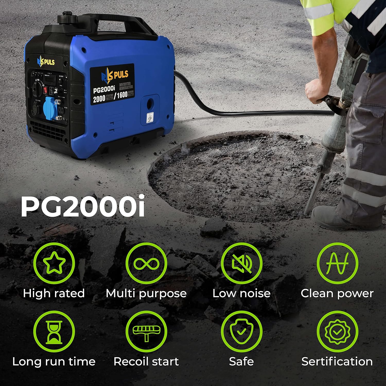2. Características destacadas de Grupo electrógeno inverter PULS energy PG2000i de 2000 vatios | Generador de energía de gasolina 2 kW | 4,5 l de capacidad del tanque | motor inverter de 4 tiempos | funcionamiento silencioso de 58 dB
