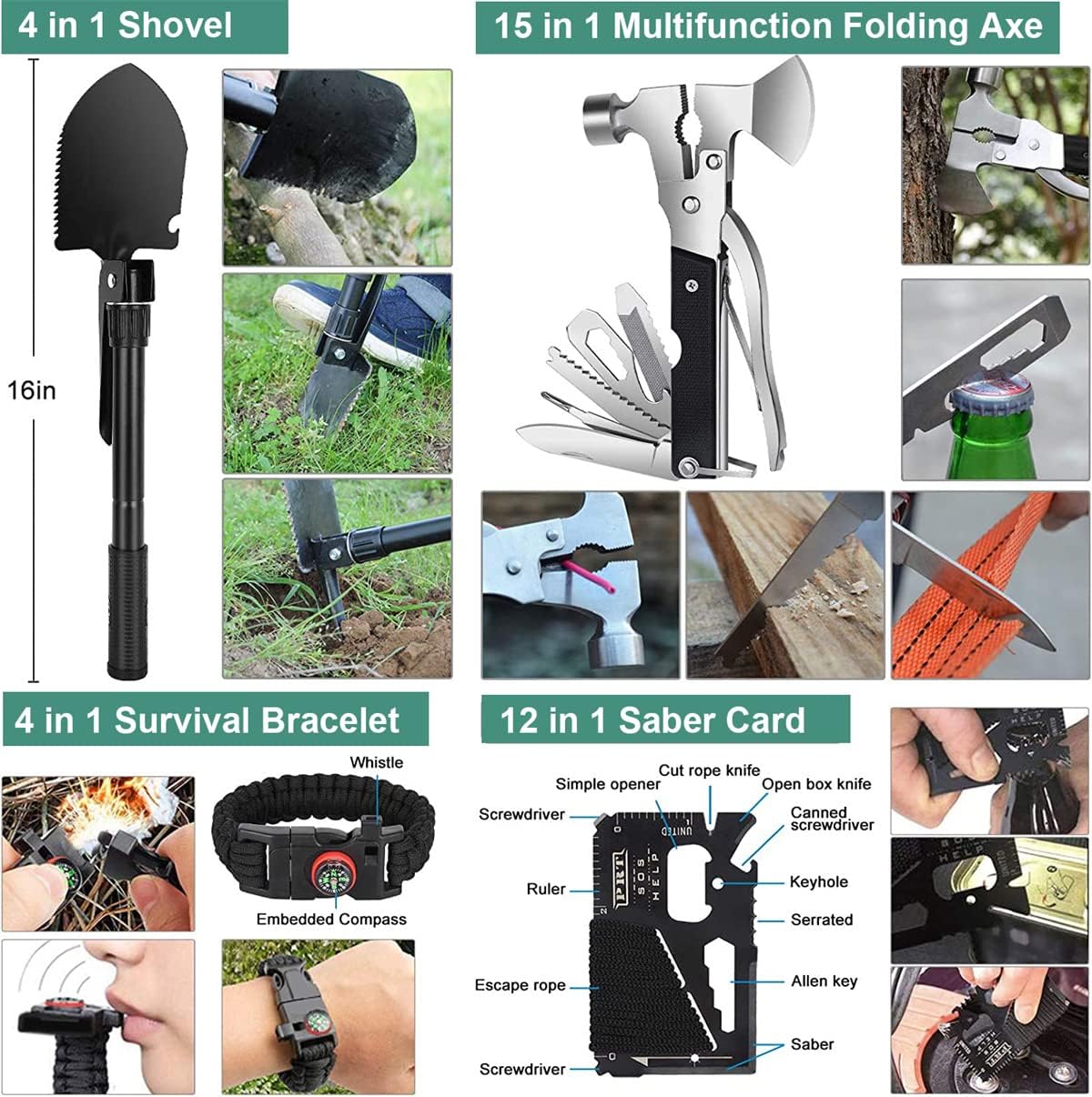 - Variedad de herramientas: Incluye cuchillo, brújula, fuego, silbato y otros utensilios esenciales.