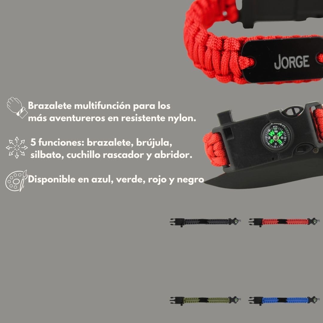 - Pulsera de supervivencia: Incluye cuerda paracord, silbato y brújula, esencial para situaciones de emergencia.