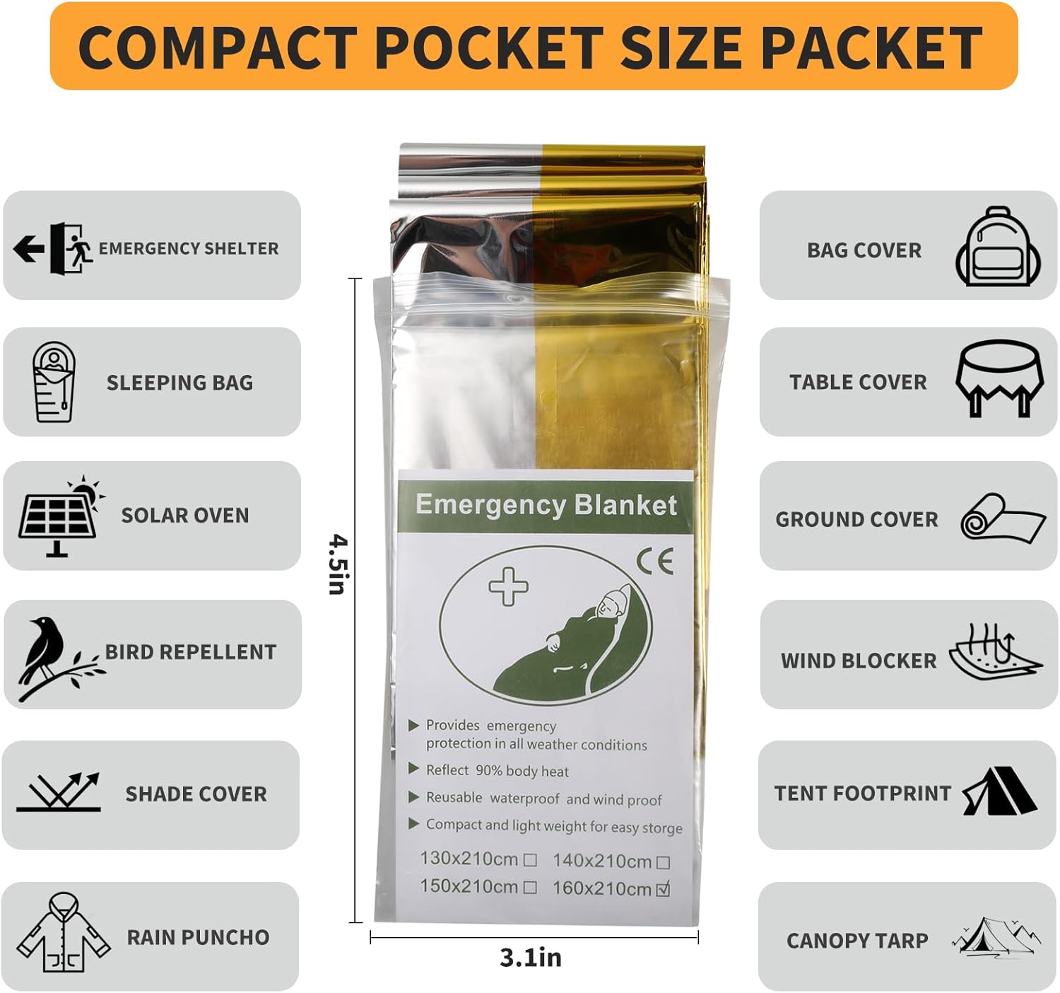 Manta Térmica de Supervivencia – 210x160cm Manta de Emergencia con Doble Cara (Oro/Plateado), 10 Unidades – Emergency Kit para Senderismo, Camping y Primeros Auxilios