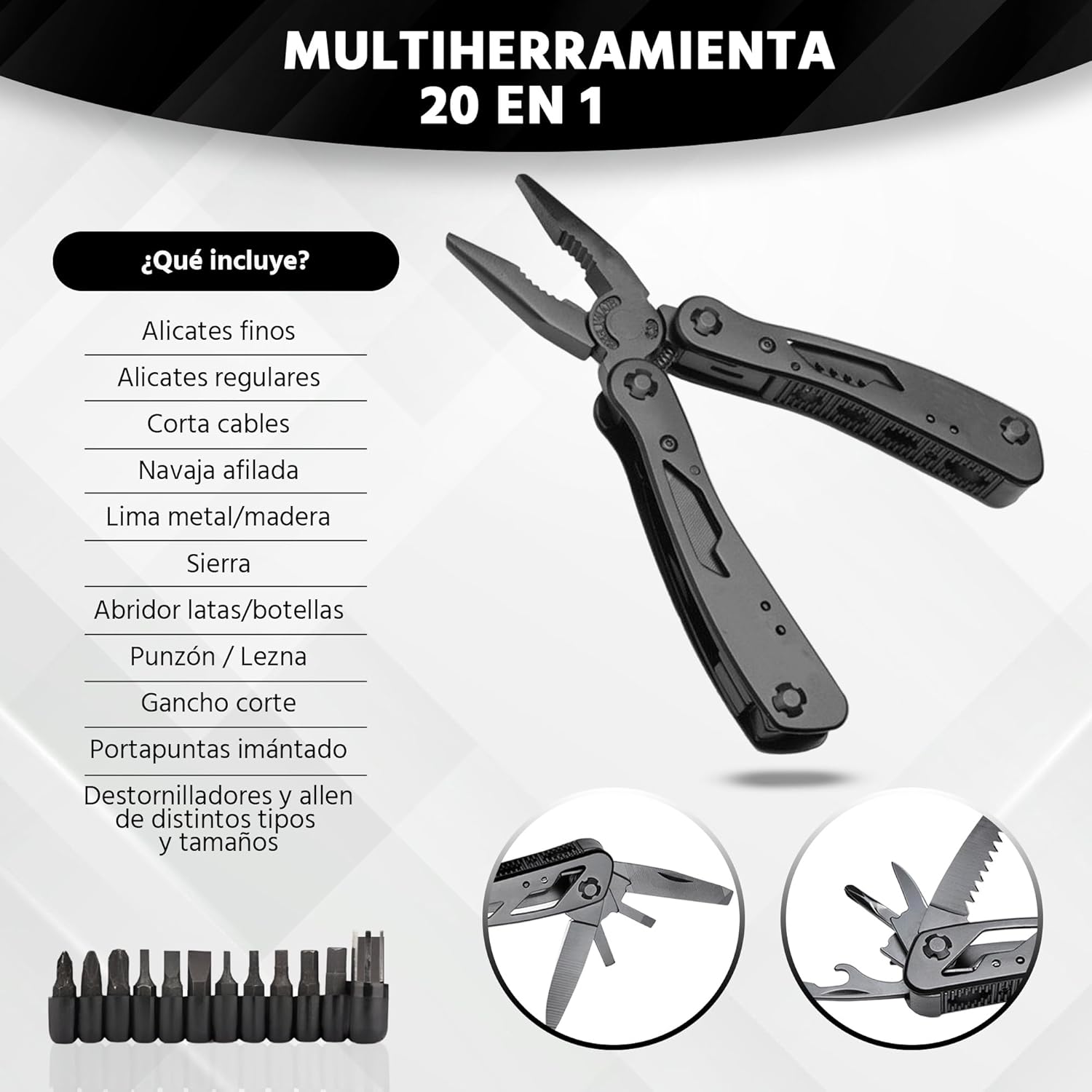 • 23 Funciones: Incluye cuchillos, destornilladores, abrelatas, alicates, y más, lo que la hace ideal para el camping, ciclismo y trabajos de bricolaje.