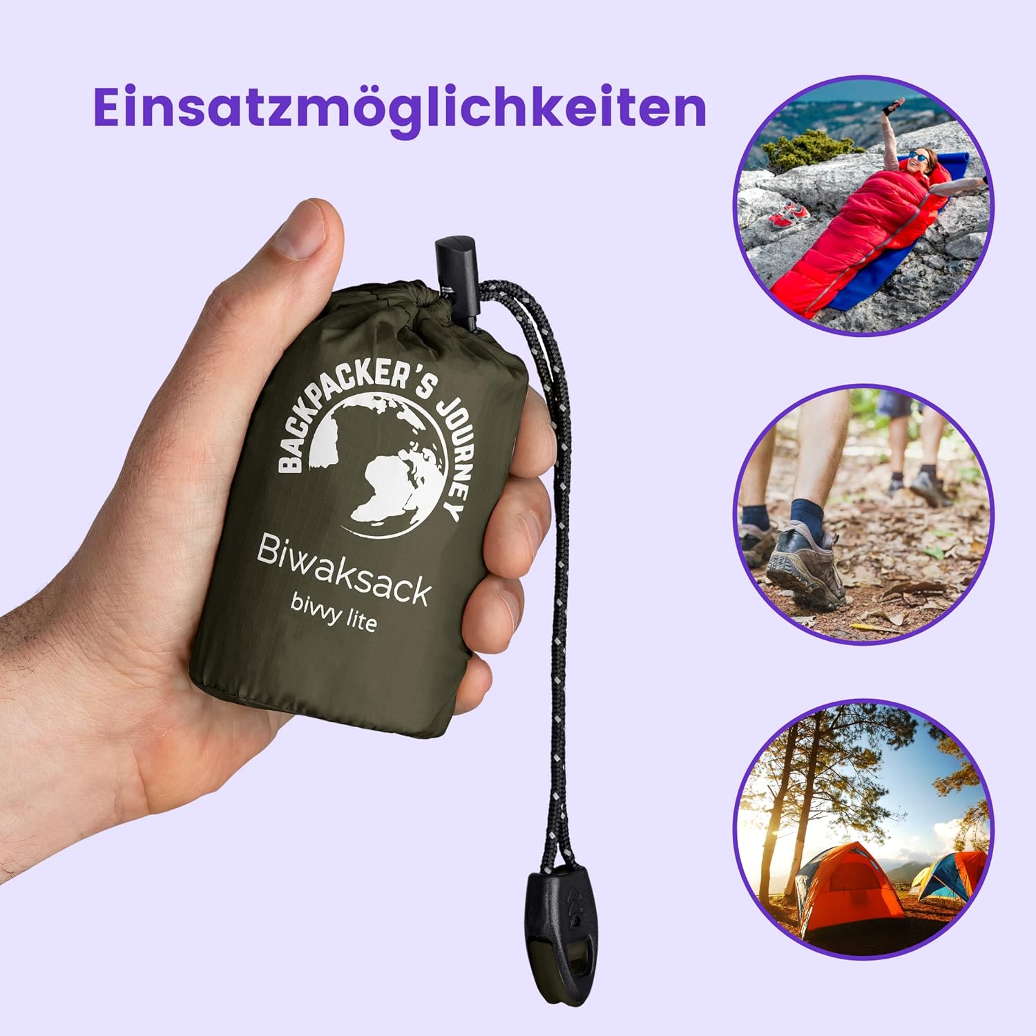 Reseña: Este paquete de "Backpacker’s Journey Biwaksack" incluye dos sacos tipo manta de emergencia en formato de saco de dormir. Son ideales para situaciones críticas como mal tiempo, agotamiento o anochecer. Sin embargo, me parece innecesario que vengan en una bolsa plástica adicional. -