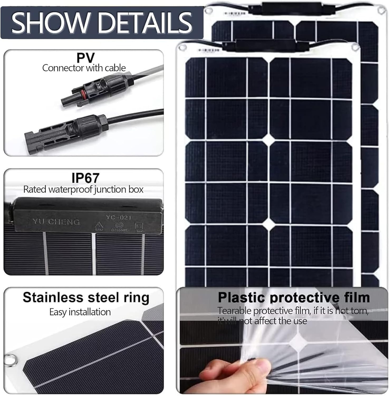 - Materiales: Hecho de silicio monocristalino de alta calidad con un recubrimiento de vidrio templado.