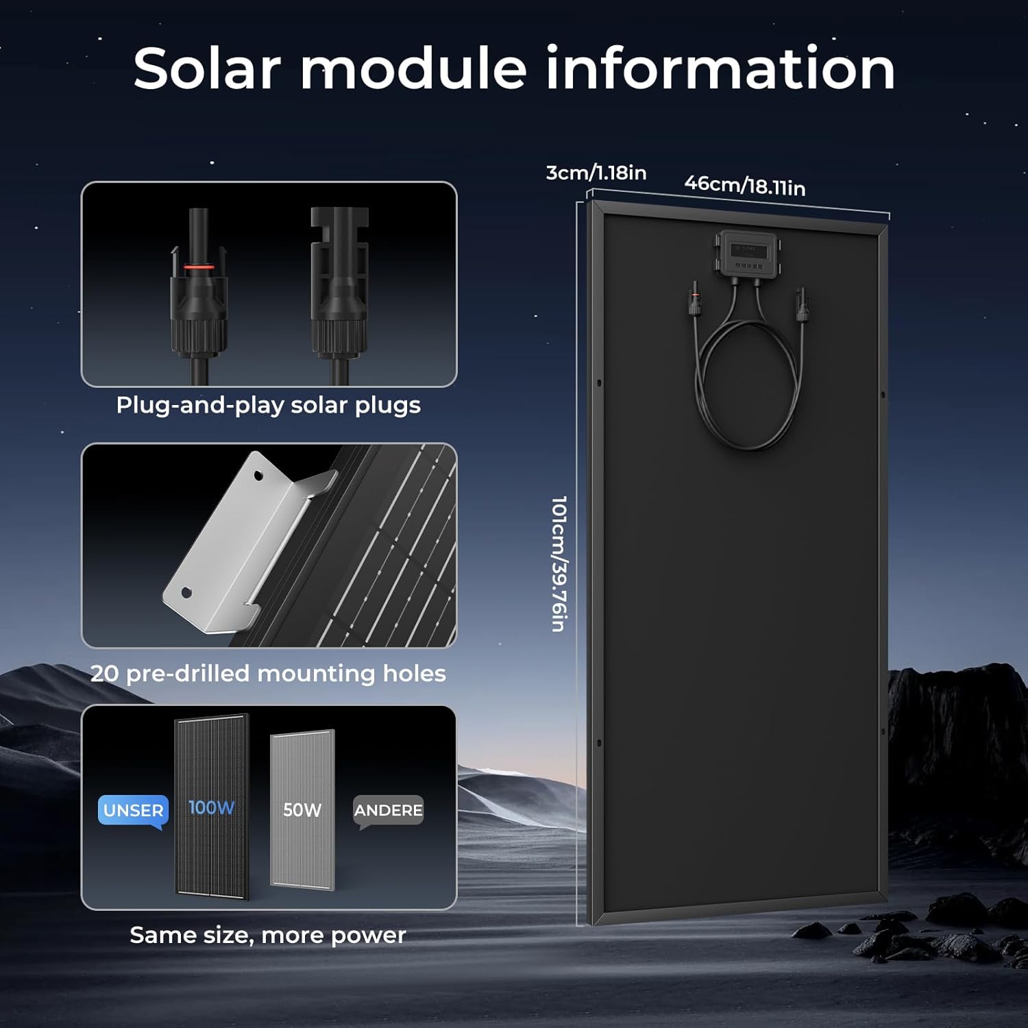 El panel solar monocristalino de 100W es conocido por su construcción de alta calidad y su diseño optimizado, que ofrece: