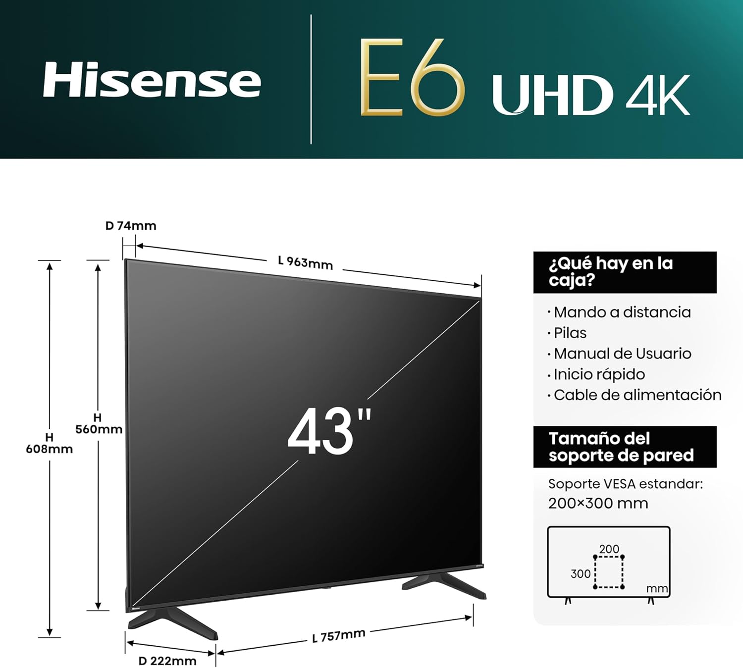 Las especificaciones técnica del Hisense 43E6NT son impresionantes y están diseñadas para un rendimiento óptimo: