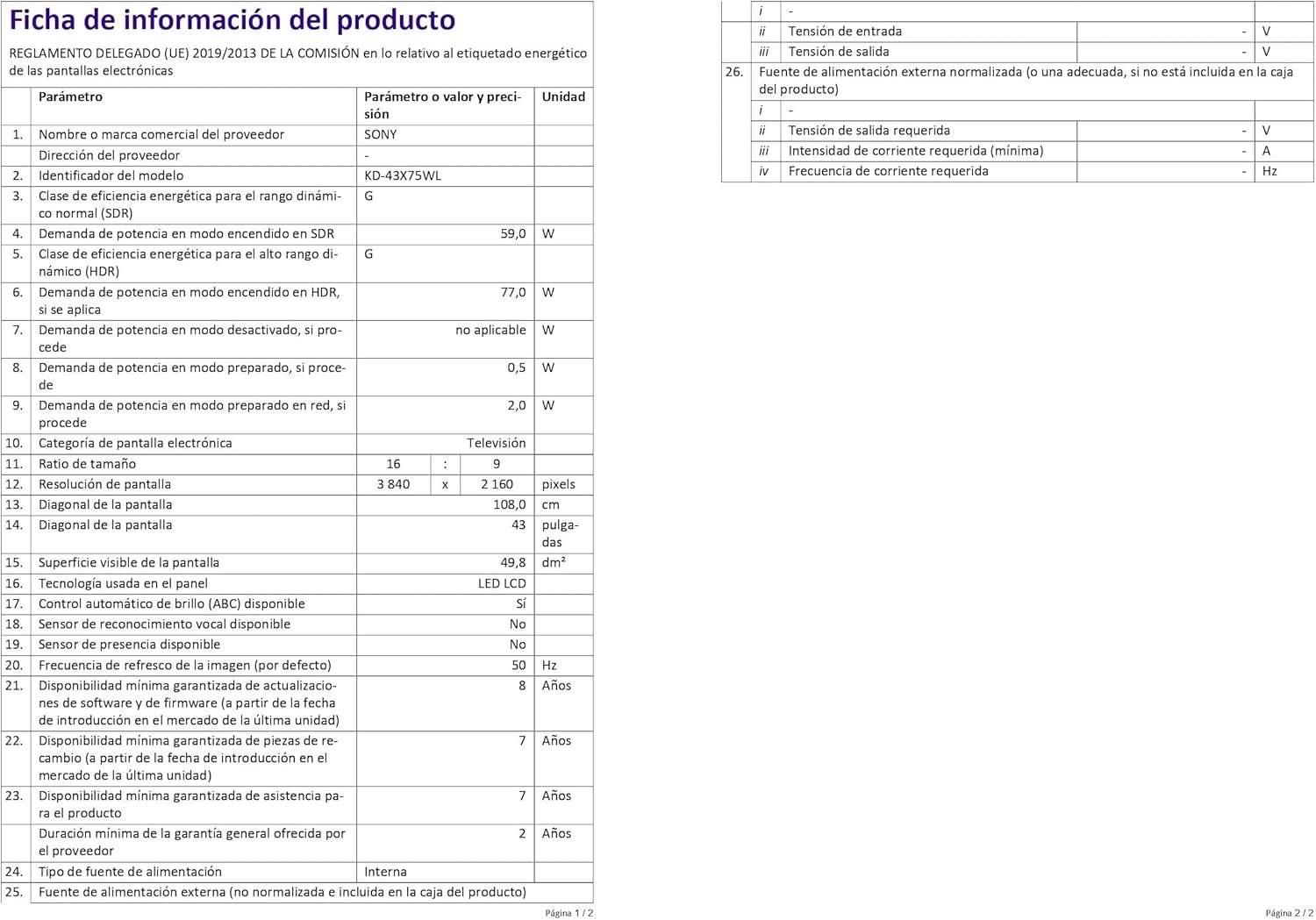 A continuación se detallan las especificaciones más relevantes del Sony BRAVIA KD43X75WL:
