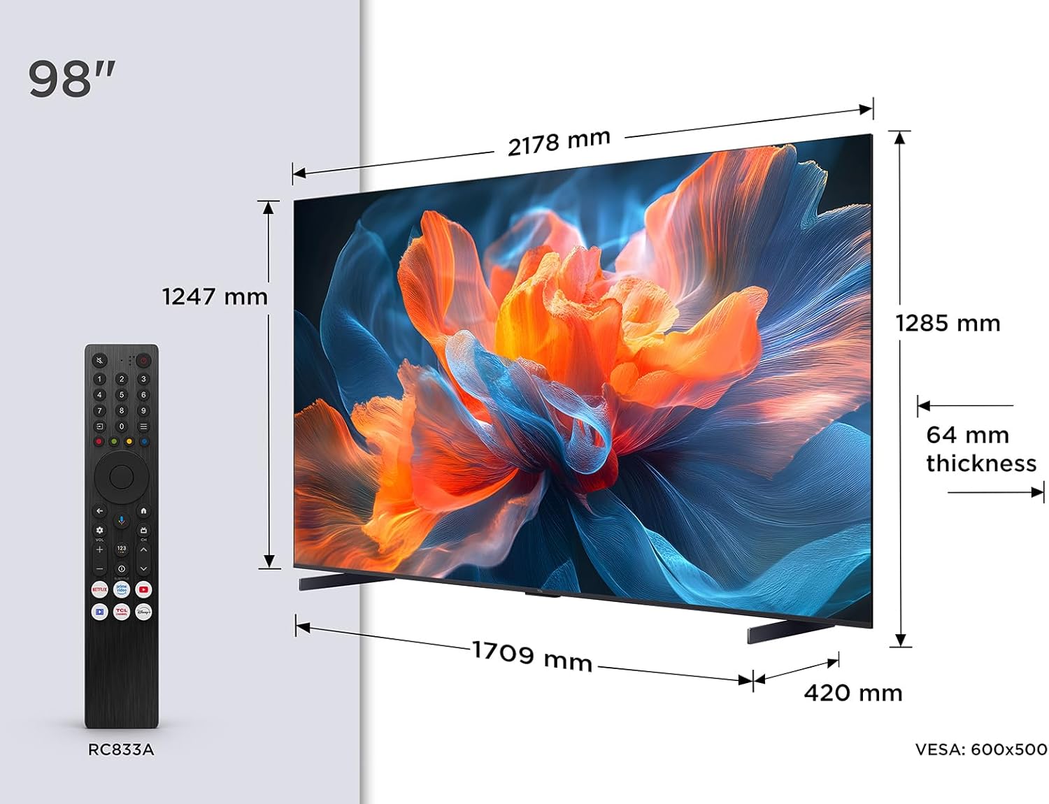 El TCL 98T8C destaca por su tamaño generoso y su pantalla QLED que promete colores vibrantes y una calidad de imagen impresionante. La tecnología HDR ofrece negros profundos y un brillo notable, lo que mejora cualquier contenido.